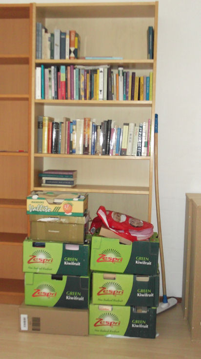 Totaal in doosjes en kast erachter: ca. acht meter boeken. Je zou het niet zeggen, aan dat schamele stapeltje.