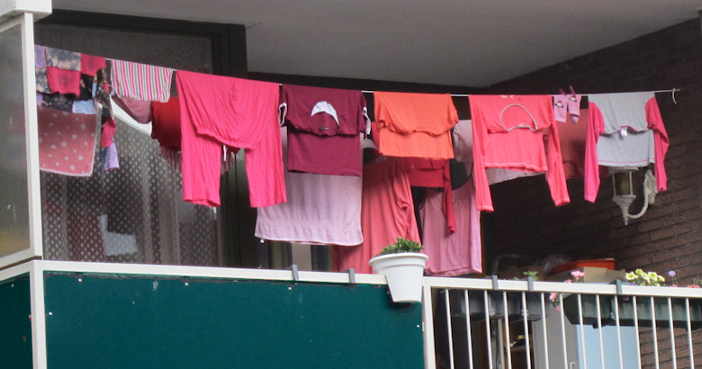 En die kleuren? Ik vind het eigenlijk wel mooi om te zien, zo'n lijn met al die tinten roze, prachtig. En dan denk ik: "Daar woont een vrouw die weet hoe ze moet wassen, die echt alles kleur bij kleur wast, wat knap!"