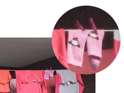 Roze shirtjes, roze pyjamabroek, roze handdoeken, roze sokken; zelfs een roze keukendoekje. Alles vastgezet met hard-fuchsia wasknijpers.